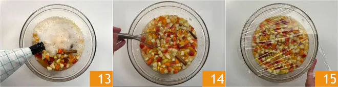 Now pour the prosecco 13 and stir one last time 14. Cover the bowl with plastic wrap 15 and let it macerate in the fridge for at least 1 hour and up to 6-8 hours.