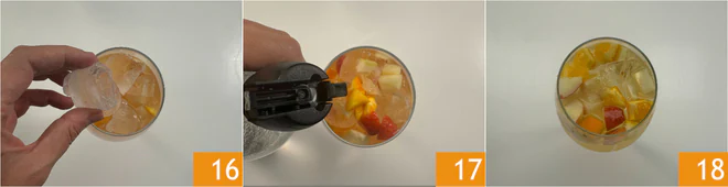 Once the maceration time has passed, put a ladle of sangria at the bottom of the glasses, add ice 16, and adjust with seltzer to taste 17. Your white sangria is ready to be served 18!