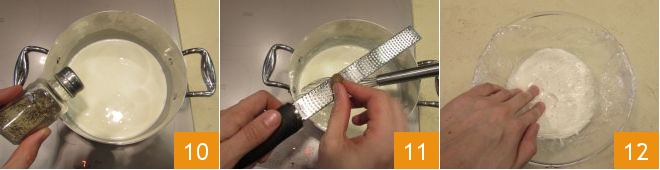 Flavor your béchamel sauce with a pinch of pepper 10, salt, a dash of nutmeg 11, and continue cooking, always stirring, for 5-6 minutes, until you reach the right thickness. At this point, transfer the béchamel into a bowl and cover with cling film on contact 12.