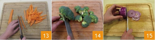 Wash all the vegetables and start cutting them: peel and julienne the carrots 13, take only the florets from the broccoli 14, and thinly slice the onion 15.