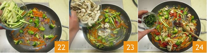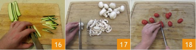 Trim the zucchini and julienne them as well 16. Clean the mushrooms, slice them 17, and cut the cherry tomatoes in half 18.