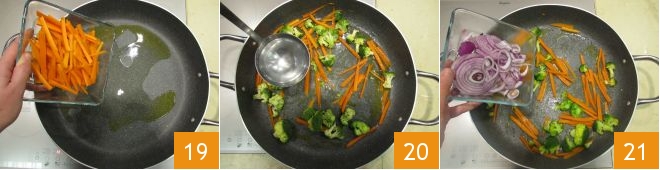 Once all the vegetables are prepared, pour the oil into a pan and add the carrots first 19, let them cook for a couple of minutes, then add the broccoli. Deglaze with a bit of water 20, cover with a lid, and let them cook for 3-4 minutes. At this point, add the onions 21.