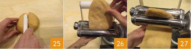 Meanwhile, your egg pasta will have rested, so take the dough and divide it in half 25. Roll out the pasta with the pasta machine 26, reducing the thickness each time 27.