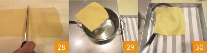 You will need to get sheets about 1/16 inch thick. Cut 8 rectangles from the sheets measuring 6x8 inches 28. Blanch the sheets for 1 minute in boiling, lightly salted water 29, then drain and place them on a tray lined with a kitchen towel 30. If you prefer, you can quickly pass the pasta sheets through a bowl of cold water to stop the cooking, then lay the rectangles on a clean towel, but the important thing is to position the various rectangles well-spread and without overlapping.