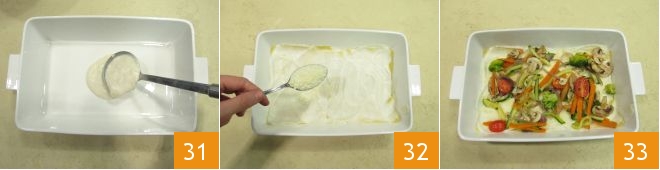 Once the pasta is cooked, take a 12x8 inch baking dish, add 2 or 3 tablespoons of béchamel 31 and spread it on the bottom of the dish. Place 2 pasta rectangles, laying them side by side, then cover with more béchamel, sprinkle with grated cheese 32, and add a third of the vegetables 33.