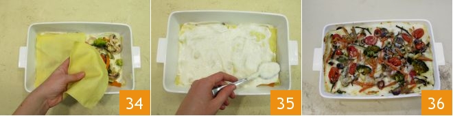 Cover with 2 more sheets of pasta 34 and proceed in this way to make 2 more layers, until you finish the ingredients. Once you reach the last layer of béchamel 35, sprinkle with more grated cheese, cover with the remaining vegetables, and bake in a preheated static oven at 350°F for 20 minutes, then turn on the grill and bake for another 5 minutes. Your white vegetarian lasagna is ready to be served 36!