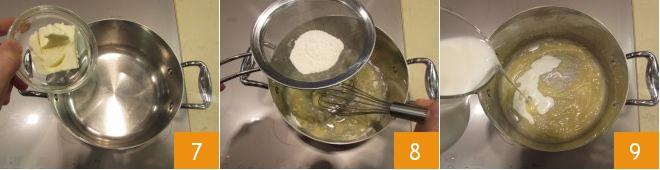 In the meantime, prepare the béchamel sauce: pour the butter into a saucepan 7, let it melt gently, then add the sifted flour, stirring quickly 8. Once you have a hazelnut-colored roux, add the boiling milk 9 and stir again.