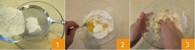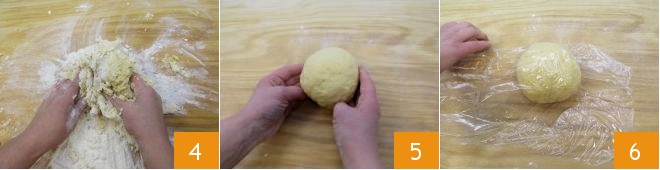 At this point, transfer the mixture to a pastry board and knead it 4, adding the flour set aside as needed, until you get a smooth, firm, and elastic dough to which you will give a spherical shape 5. Wrap it in plastic wrap 6 and let it rest for about 30-60 minutes outside the fridge in a cool, dry place.