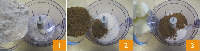 To prepare whole wheat cookies, start by making the dough: place the whole wheat flour 1, muscovado sugar 2, and cold refrigerator butter cut into cubes 3 in a mixer.