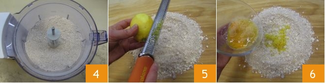 Blend everything until you get a crumbly mixture 4, then transfer it to a work surface. Add grated lemon zest 5 and lightly beaten eggs 6.
