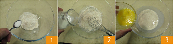 To make the whole wheat crepes with mascarpone and mushrooms, pour the flour into a bowl, add the salt 1, pepper, and pour in the milk while whisking 2. Also incorporate the egg 3
