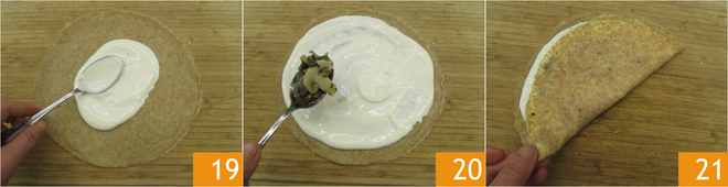 Now fill each crepe with two tablespoons of sauce 19 and the mushrooms 20. Fold the crepe 21