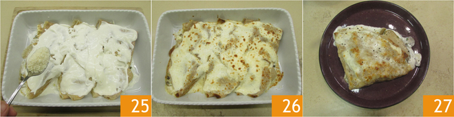 Pour the remaining sauce on top and sprinkle with grated cheese 25. Bake in a static oven at 392°F for 10 minutes, then switch to grill for 2-3 minutes to brown the surface well. The whole wheat crepes with mascarpone and mushrooms are ready, take them out of the oven 26 and serve them hot 27.