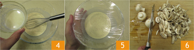 and the melted butter at room temperature 4, continue mixing with the whisk to obtain a smooth and lump-free batter. Cover the bowl with plastic wrap 5 and let it rest in the refrigerator for 30 minutes. Meanwhile, clean the mushrooms: remove the earthy base and impurities with a damp cloth. Slice the mushrooms 6.