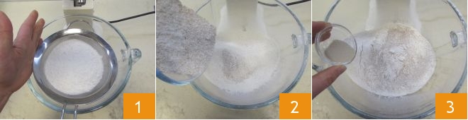 To prepare the whole wheat focaccia, start by sieving the Manitoba flour into the bowl of the stand mixer 1. Then add the whole wheat flour 2 and the dried brewer's yeast 3.
