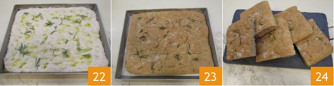 Add the sprigs of rosemary 22 and bake in a preheated static oven at 428°F for 40 minutes (we do not recommend baking in a ventilated oven). Once cooked, remove the whole wheat focaccia 23 and serve it as you like 34!