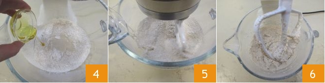Add the fine salt 7 and oil 8, continuing to work the dough at moderate speed for another 5 minutes. Then stop the mixer 9