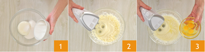 To prepare the whole wheat plumcake, start with the batter. Take the ricotta and place it in a bowl with the granulated sugar 1, begin to beat with a mixer until you obtain a smooth cream 2, then add the eggs one at a time 3.