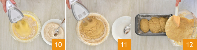 Continue working with the electric mixer and, while it's running, begin to gradually add the whole wheat flour 10 11. Mix for about a couple of minutes, until you obtain a homogeneous batter. Pour the batter into a 5.5x9 inch loaf pan lined with parchment paper 12.