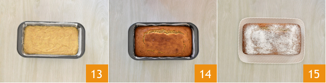 Gently level the surface 13 and bake in a preheated static oven at 350°F for 45-50 minutes. When ready, remove from the oven 14 and let cool. Then unmold it onto a serving plate and sprinkle with powdered sugar 15. Your whole wheat plumcake is ready to be enjoyed!