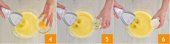 Wait until they are well incorporated before adding the next one 4. With the mixer still running, gradually add the sunflower oil 5 and the milk 6.