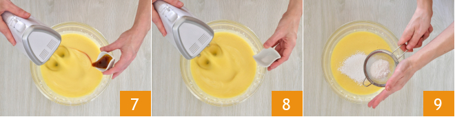Also add the vanilla extract 7 and the pinch of salt 8 and continue mixing for about 1 minute. Sift in the baking powder 9 to eliminate any lumps.