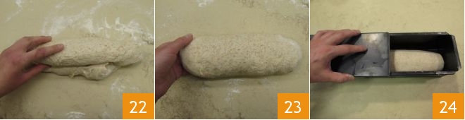 and work it briefly with your hands to roll it up without flattening it 22, forming a loaf of the same length as the pan 23. Place the loaf in the pan 34, close it with the lid, and let it rise in the oven turned off with the light on for about 2 hours.