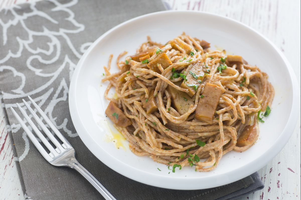 And you know what? Those golden pasta strands mixed with moist seitan bits create a plate that looks—and tastes—like the real deal, but a bit lighter and definitely more plant-forward. Really, really tasty.