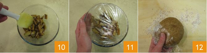 and mix everything together 10. Then cover with plastic wrap 11 and let it marinate until cooking time. After 30 minutes, take the dough again 12, break off a piece