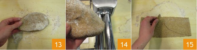 and flatten it using a bit more whole wheat flour 13. Pass it through the pasta machine 14, starting from the widest thickness and gradually reducing it. Fold the dough sheet 15 and pass it through once again to smooth it out.