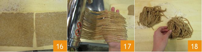 When you have obtained a rectangle of dough, cut it to the desired length to make the spaghetti 16 and pass it through the appropriate roller 17. As the spaghetti is ready, place it in nests on a floured board 18.