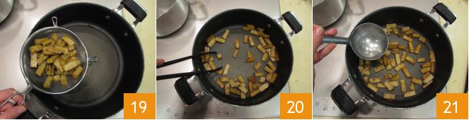 Once you have prepared the spaghetti, place a pot full of salted water on the stove for cooking the pasta; then proceed with the seasoning. Pour a drizzle of oil into a pan, add the seitan drained from the marinade 19 and braise it 20. When it is well browned, add a ladle of water and let it deglaze.