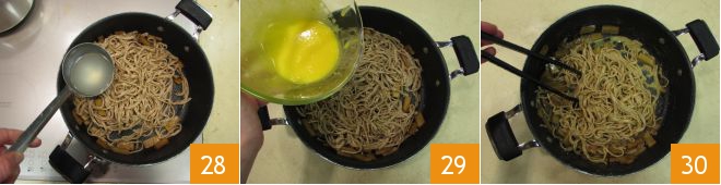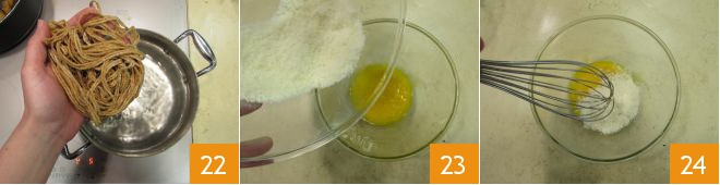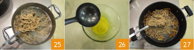 Stir the spaghetti occasionally 25 and pour a ladle of cooking water into the egg mixture 26. Then drain the spaghetti, keeping aside a little more cooking water, and transfer them into the pan with the seitan 27.