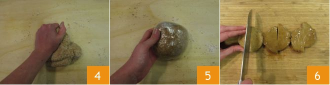 Then transfer the mixture to a surface, work it until you get a compact dough 4, and wrap it in plastic wrap 5. Let it rest at room temperature for about 30 minutes. Then take the seitan and cut it into slices first 6
