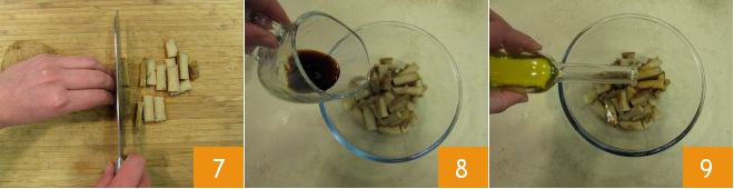 and then into strips 7. Transfer it into a bowl, add soy sauce 8, a drizzle of oil 9, and a grind of pepper