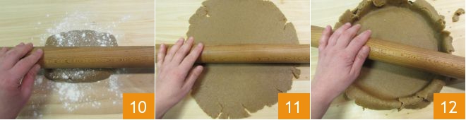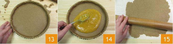 At this point, take the shortcrust pastry, divide it in half and roll it out on a lightly floured surface 10. You should obtain a disc about 1/4 inch thick 11. Transfer it to a 12-inch pan (no need to grease it). Shape the pastry with your hands to adhere well to the pan, then use a rolling pin to press the surface to remove excess pastry 12 and mix it with the reserved pastry, kneading briefly. If it's very hot, you can store the pastry in the refrigerator.
