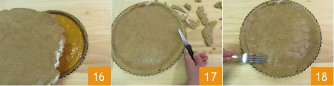 This way it will be easier to lift the disc and place it over the tart. Trim the excess pastry with a small knife 17 and use your fingers to seal the edges. Prick the surface of the tart with a fork 18