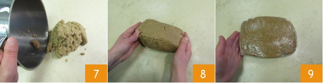 When you have obtained a homogeneous mixture, transfer it onto a work surface 7 and work briefly, just enough to compact the pastry and obtain a dough 8. Wrap in plastic wrap 9 and let it rest in the refrigerator for at least 30 minutes.