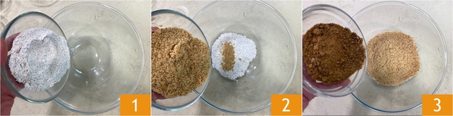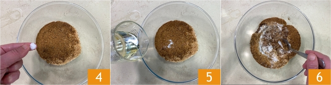 Add a pinch of salt 4, then gradually pour in the oil 5 while stirring with a spoon 6.