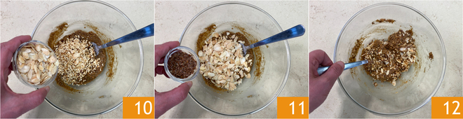 Finally add the sliced almonds 10 and the flax seeds 11. Mix until you obtain a homogeneous mixture 12.