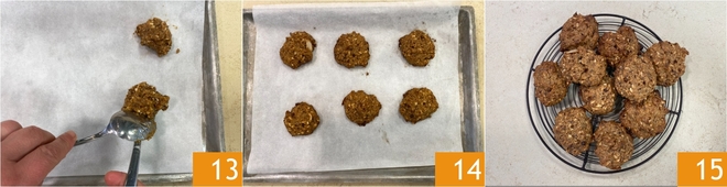 Form the biscuits by taking about 35 g of mixture at a time (approximately 1 1/4 oz) and dropping them with the help of 2 tablespoons onto a baking sheet lined with parchment paper 13; with these quantities you will make about 10 cookies. Bake in a preheated conventional oven at 356°F, then remove from the oven and let cool 14. Your wholemeal biscuits with dried fruit are ready to be enjoyed 15!