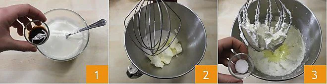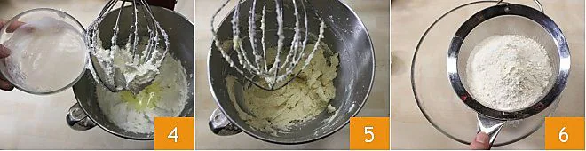 the cream mixed with vanilla 4, then mix again to combine the ingredients 5. At this stage, it's important that all ingredients are at the same temperature; otherwise, the butter will immediately become lumpy. If this happens, don't worry: adding flour, which is a stabilizer, will make everything homogeneous. Sift together, in a bowl, the flour, cornstarch, and baking powder 6.