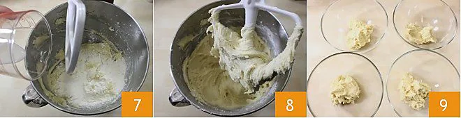 Add the dry ingredients to the mixture, alternating them with the milk 7, and keep mixing: you will get a very thick, soft, and compact mixture 8. Divide the dough into 4 equal parts 9: one part will remain white, while the other three will be colored.