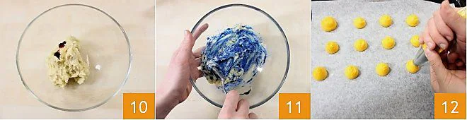 Add a few drops of food coloring to the three parts of dough to be colored 10: you can choose your preferred color; we used yellow, red, and blue. Start by adding a little coloring, then mix vigorously 11, and if the color doesn't satisfy you, add more coloring until you get the desired shade. Transfer the mixture to a piping bag with a plain tip, and on a baking sheet lined with parchment paper, squeeze the dough to form rather tall disks, 1 inch in diameter 12.