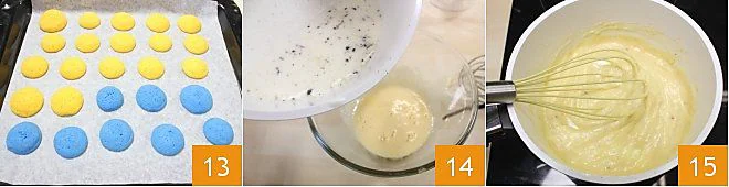 Bake the whoopie in a preheated static oven at 356°F for 13-14 minutes (if fan-assisted, 320°F for 10-12 minutes) 13. Meanwhile, prepare the pastry cream according to the instructions Pastry cream: heat the milk in a saucepan with half of a vanilla bean and its seeds; whisk the yolk and sugar in a bowl, then add the flour. With tongs, remove the bean and pour the heated milk over the mixture in a thin stream 14, blending with the whisk. Return the mixture to the heat and stir continuously until the cream thickens 15. Transfer the pastry cream to a bowl and let it cool, storing it with a sheet of cling film in contact. Remove the whoopie from the oven and let them cool on a wire rack.