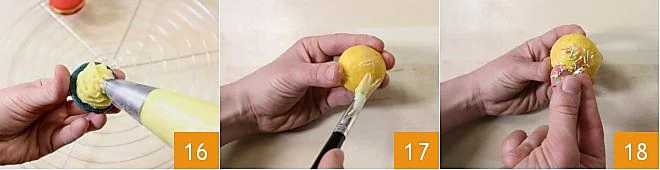 When they are cool, transfer the cream into a piping bag, saving a couple of tablespoons. Assemble the rainbow whoopie: take a colored disk and fill it with a dollop of cream; take another disk of the same or a different color, brush the surface with the reserved cream 17, and place it on the filled disk, pressing lightly. Sprinkle the brushed surface with sprinkles, which will adhere well 18. Fill all the other whoopie in this way until they are finished: your rainbow whoopie are ready!