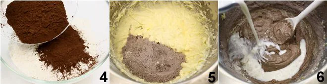 Sift the flour with cocoa, baking powder, baking soda, and salt 4 and add half of it to the previously prepared mixture 5, blending it with a wooden spoon; then add half of the warm milk 6.