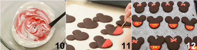 If you wish to make the decorations, prepare royal icing by whipping 1 egg white and adding 5.3 oz of powdered sugar. Divide the mixture into 3 small bowls, one to leave white, 1 to color red 10, and 1 yellow using food coloring. Then make Mickey's red shorts with the corresponding yellow buttons 11 and Minnie's bow, red with white polka dots. You should decorate only half of the cakes 12.