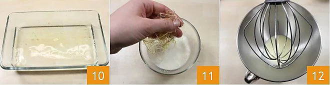 In the meantime, you can prepare the stracciatella cream. Soak the gelatin in cold water for 10 minutes 10, then squeeze it and dissolve it in 1.8 oz of cream that you have heated in the microwave 11. In the bowl of a stand mixer fitted with beaters, place the Nestlé condensed milk at room temperature 12,