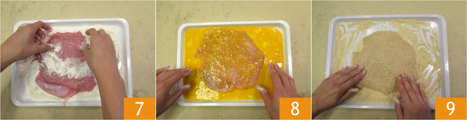 Bread the cutlet starting by passing it in the flour 7, then in the egg 8 and finally in the breadcrumbs 9. Press well with your fingers so that the breadcrumbs adhere well to the meat.